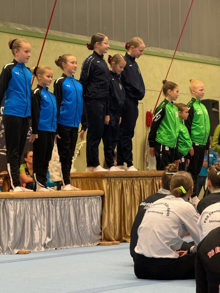 Bei der Nordwestdeutschen Meisterschaft in Schwerin erreichte unsere Damen-Gruppe bestehend aus Liliana Renner, Finja Heinze und Amilia Selinghoff mit 21,490 Punkten einen herausragenden 2. Platz und sicherte sich somit den Titel der Nordwestdeutschen Vizemeisterinnen in der Kategorie WKK 1.1 Damen Gruppe. Wir sind unglaublich stolz auf diese Leistung und gratulieren den drei Sportlerinnen von Herzen!
