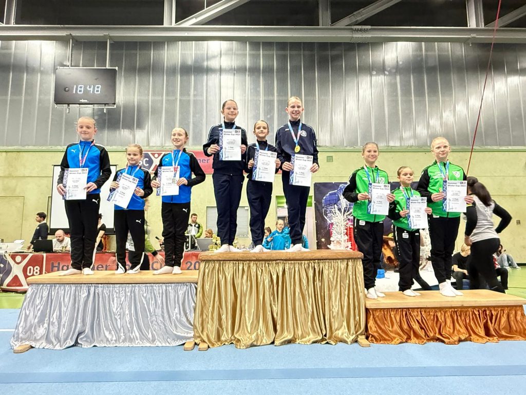 Weitere solide Ergebnisse erzielten die Damengruppe WKK 1.1 mit Liliana Renner, Finja Heinze und Amilia Selinghoff, die sich mit 20,540 Punkten den 2. Platz sicherten. In derselben Kategorie belegten Livia Fiedler und Sura Vuran als Damenpaar den 5. Platz mit 20,190 Punkten, während das Team um Anna Emminger, Mailin Heinze und Leonie Kempkes als Damengruppe in der WKK 1.2 den 10. Platz mit 20,150 Punkten erreichte. Das Damenpaar Juna Testdorf und Anna Otmar belegte den Platz 11 mit 20,140 Punkten.